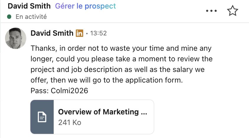 ๐€๐ญ๐ญ๐ž๐ง๐ญ๐ข๐จ๐ง ๐šฬ€ ๐œ๐ž๐ฌ ๐Ÿ‘ ๐œ๐จ๐ฆ๐ฉ๐ญ๐ž๐ฌ : ๐ƒ๐š๐ฏ๐ข๐ ๐’๐ฆ๐ข๐ญ๐ก, ๐„๐ณ๐ข๐ง๐ง๐ž ๐€๐ง๐ฒ๐จ๐ค๐ฎ ๐ž๐ญ ๐๐ซ๐ข๐ฌ๐œ๐ข๐ฅ๐ฅ๐š ๐Œ๐š๐œ๐š๐ฎ๐ฅ๐š๐ฒ ! Je n'ai jamais dรฉnoncรฉ des gens comme รงa (je dรฉteste รงa) mais laisser circuler le mal parmi nous ferait beaucoup de dรฉgรขts pour d'autres. Ils font semblant de vous offrir un job avec un ficher archive ร  ouvrir avec un mot de passe #Colmi2026. Ils s'attaquent aux experts Google Ads et Meta Ads qui utilisent le systรจme Windows. Heureusement que leurs tentatives n'ont pas marchรฉ sur mon appareil (pas windows). Voici un texte d'un collรจgue sur LinkedIn : "c'est un virus/trojan qui va hacker votre profil Google, j'ai eu la mauvaise expรฉrience d'ouvrir le fichier et ai dรป rรฉinitialiser mon ordinateur. Pour les experts en Google Ads/Facebook Ads, il va ajouter des publicitรฉs dans vos comptes et ils vont s'auto-ajouter รฉgalement en tant que partenaires de votre portefeuille business." Rester sur vos gardes. #SEA #GoogleAds #SMM #MetaAds #MarketingDigital #Virus #Piratage